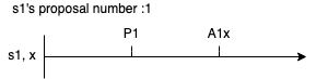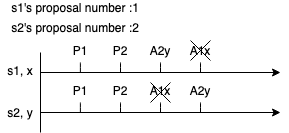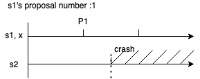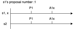 - There are two nodes, s1 tries to propose value x, s2 does not propose values.