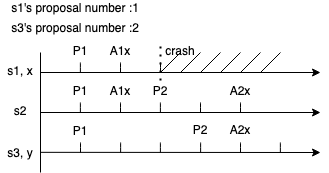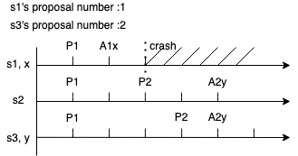 - s3 crashes, and s1 cannot get majority of instances to finish the prepare phrase, so it fails to propose.