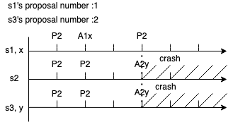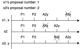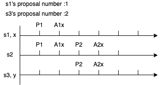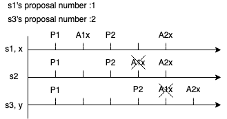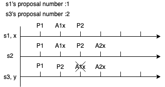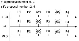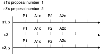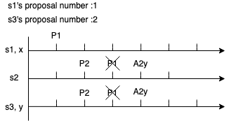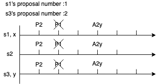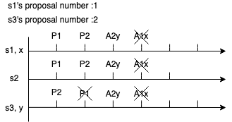 - When s3 gets the majority responses for the proposal 2, it knows that s1 has already accepted value x, so s3 also updates its value to x(according to rule phrase 2a).