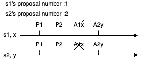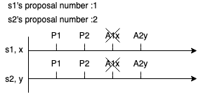 - When s1 submits accept requests of proposal number 1 to s1 and s2, it fails on both nodes. Because both nodes have finished responding the prepare request of proposal number 2, and promise that they won’t accept any proposal number less than 2(according to rule phrase1b).
